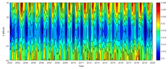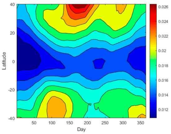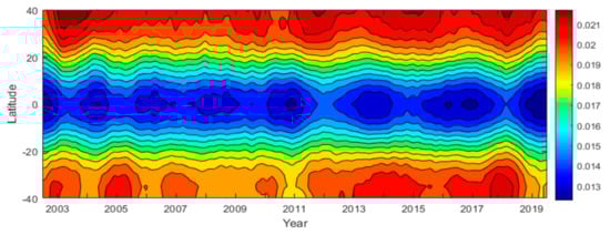 Figure 4 shows the 18-year average atomic oxygen volume mixing ratio as a function of latitude and date at 96 km. The atomic oxygen volume mixing ratio showed an upward trend in its overall structure with the increase in latitude. There were two maximum values near days 140 and 310, and two minimum values near days 50 and 230.