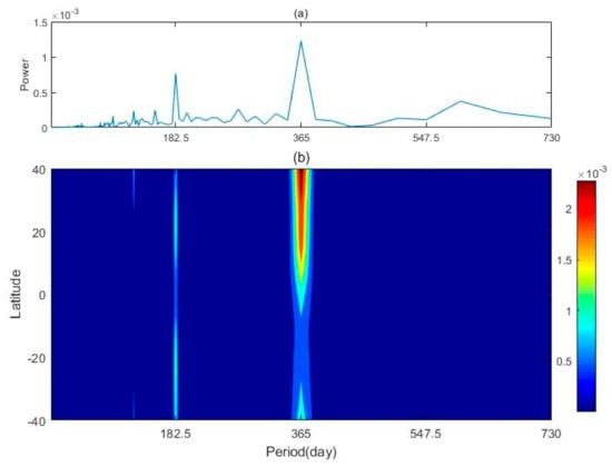 Figure 3 displays the FFT result of the atomic oxygen volume mixing ratio at the equator, and the FFT result of the atomic oxygen volume mixing ratio in the latitude range of 40° S–40° N. The results show that there was SAO-type variation and AO-type variation in the volume mixing ratio at the equator. It indicates that the oscillations in the atomic oxygen volume mixing ratio vary with latitude, and the AO is slightly stronger than SAO at the equator. In the latitude range of 40° S–40° N, the AO is more dominant with the increase in latitude, especially in the northern hemisphere.