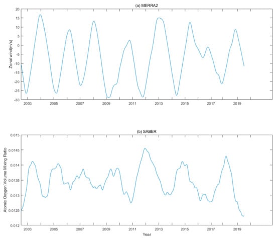 Figure 2 with a 365-day sliding window and observed a clear quasi-biennial oscillation in the atomic oxygen volume mixing ratio around the equator. Because there are no previous results of the QBO in the atomic oxygen volume mixing ratio with which to compare, and considering the QBO wind modulation of the tides, we decided to compare correlations between the atomic oxygen volume mixing rate QBO and equatorial stratosphere QBO based on the MERRA-2 data. The QBO is a very strong signal in the stratospheric zonal wind, and we only used a 365-day smooth window to highlight the QBO phenomenon in MERRA2.