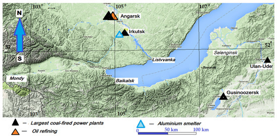 In terms of the impact of pollution on the dynamics of ozone in the study area, two industrial sites are of the greatest interest: the Irkutsk–Angarsk site in the valley of the Angara River flowing from Lake Baikal and the Selenga River site flowing into Lake Baikal from the Buryatia side. Figure 1 shows the location of the main source cities of air pollution and the monitoring stations.
