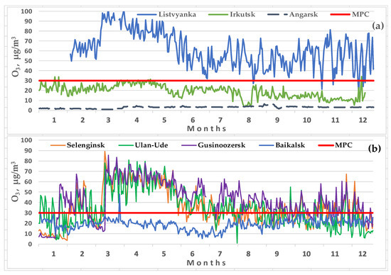 The annual variability of the ozone concentrations: (a) in the cities of the Angara River valley and at Lake Baikal; (b) in the cities of the Selenga River valley for 2021. (MPC is the maximum permissible concentration, average daily values.)