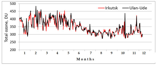 Seasonal variabilities of the total ozone concentrations (Dobson units) in the atmosphere above the Angara River valley (Irkutsk) and Selenga River valley (Ulan-Ude) in 2021 (based on the data at https://ozonewatch.gsfc.nasa.gov/data/omi/, accessed on 16 February 2022).
