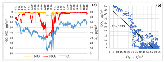 An example of a five-minute recording of the concentrations of ozone and nitrogen oxides at the Listvyanka station (a) during the transport of the plume from the remote thermal power plant above the Listvyanka monitoring station on 27–28 November 2021 and the scattering diagram (b).