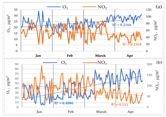 Variability of daily average concentrations of O3 and NO2 in Irkutsk (a) and Ulan-Ude (b) from January to April 2021.