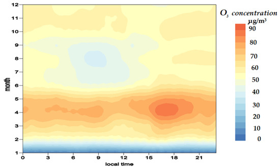 Based on the 2021 data (Figure 6), the ozone maximum at the Listvyanka station was also at 18 o’clock (local time) in spring months which have the longest sunny days and very low precipitation amount (Table 1). The minimum was in January (the minimum day length) as well as in the early morning hours in summer and autumn due to weaker ozone photogeneration during longer nights and more cloudy and rainy weather.