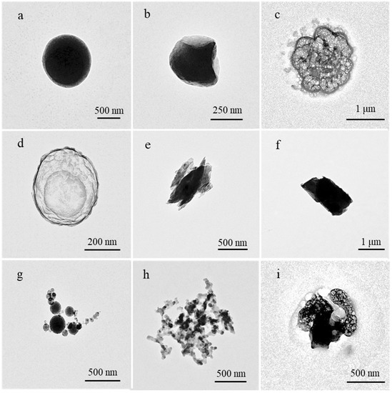 Fly ash particles (Figure 1g) can be subdivided into three types, including Si-based fly ash particles, Fe-based fly ash particles and Zn-based fly ash particles. Fly ash particles are extremely stable under the electron beams and generally show regular spherical or quasi-spherical shapes. TEM showed that fly ash particles are easily mixed with sulfate particles.