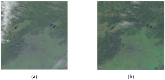Figure 2. Corrected remote sensing images. Here, (a,b) are two remote sensing images with different haze levels on different dates. The corrected results show that the size and range of the images are the same.