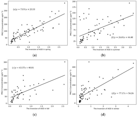 Linear regression between Aerosol Optical Depth (AOD) and PM2.5 (a) The inversion in spring; (b) The inversion in summer; (c) The inversion in fall; (d) The inversion in winter.