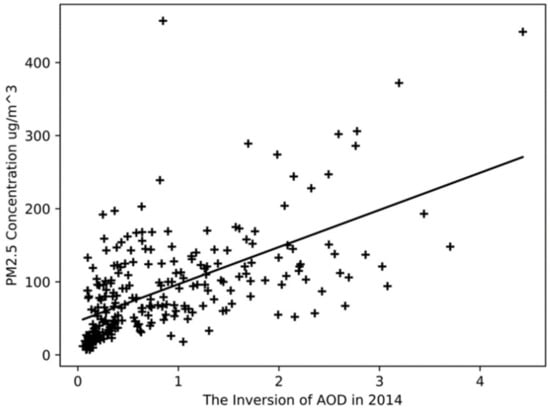 We also performed a linear fit to the inversion results of AOD in the whole year of 2014, as shown in Figure 7. The y-intercept is 45.85, the slope is 50.79, and the correlation coefficient R is 0.59. Compared with the results of the four seasons, the correlation coefficient of the linear fit for the whole year is 30% lower than that of the spring. We think this is because the four seasons have different factors, such as different climatic characteristics, industrial activities, and gas emissions caused by heating demand, which contribute to the correlation between AOD and PM2.5 concentration. Therefore, we conclude that studying the correlation performance of AOD and PM2.5 according to the season division can provide a more accurate basis for analysis.