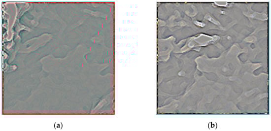 Figure 8a is a convolution result diagram when the haze is severe in spring, and the bright block is in the upper left corner of the image. We find a cloud layer in the area comparing it with the original image, which indicates that the cloud layer appears bright in the convolution result. The remaining areas with severe haze are darker, where the difference between emissivity and reflectance is more significant. Figure 8b is a convolution result graph containing minimum cloud information and a lower haze concentration level. The brighter feature in Figure 8 is the area where the AOD is low. The difference between the emissivity and the reflectance is slight. We found that the haze level prediction model can effectively distinguish the image characteristics of different haze concentrations by comparing the results. We labeled the cloud information of the image when marking the dataset, avoiding the mistakes where the cloud was identified as haze.