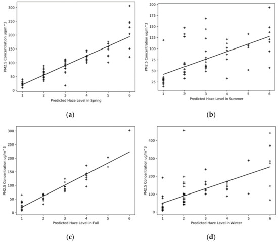 Linear regression between haze level using CNN and PM2.5 (a) Linear regression for CNN and PM2.5 in Spring; (b) Linear regression in Summer; (c) Linear regression in Fall; (d) Linear regression in Winter.