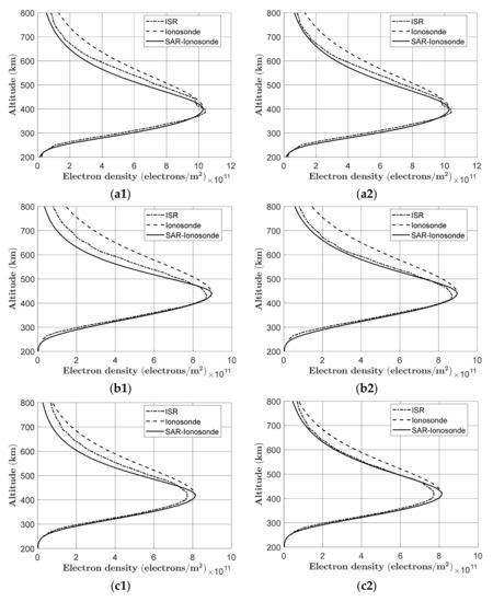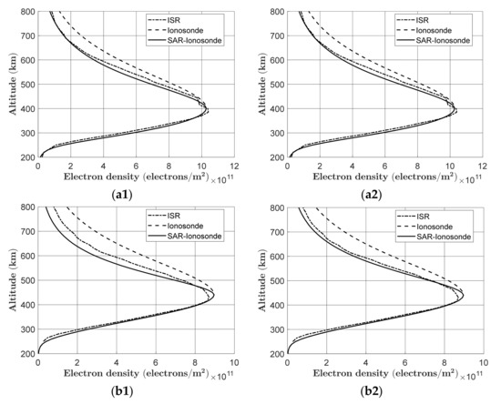 Combined retrieval of electron density using four groups of L-band and P-band SAR and the ionosonde with low systematic errors. Figures (a1–d1) in the left column are results of L-band from 23:00 to 02:00 12 June 2002. Figures (a2–d2) in the right column are results of P-band from 23:00 to 02:00 12 June 2002.