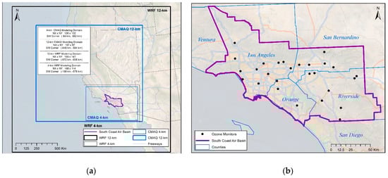 Study area: (a) Geographic extents and modeling domain parameters; (b) South Coast Air Basin study region with monitor locations and SoCAB counties.