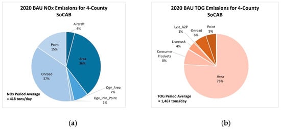 Four-county South Coast Air Basin 2020 BAU emissions by sector: (a) NOx emissions; (b) TOG emissions.