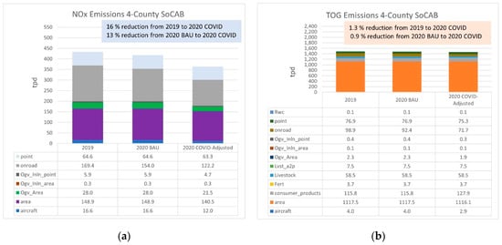 Four-county South Coast Air Basin 2019, 2020 BAU, and 2020 COVID emissions comparison by sector: (a) NOx emissions; (b) TOG emissions.
