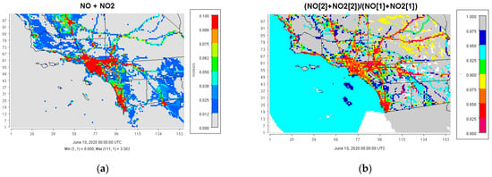 Example of model-ready NOx emissions on the 4-km domain: (a) 2020 BAU NOx emissions; (b) 2020 BAU/2020 COVID NOx emissions.