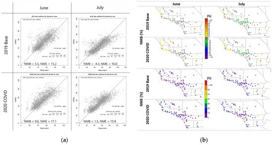 Figure 5a shows scatter plots of MDA8 ozone performance for all sites in the 4-km domain for June and July for 2019 and 2020 COVID. The x-axis is observed MDA8 ozone, and the y-axis is CMAQ MDA8 ozone. Each point represents MDA8 ozone for one site on one day. NMB and NME are displayed in Figure 5a. For each case, the NME is between 15.9% to 17.1%, which easily meets the performance criterion and nearly meets the criteria goal. NMB has more variation between the four cases. For 2019, there is a positive NMB of 5.5% in June and a negative bias of −4.3% in July; these values are close to the performance goal. For 2020, there is a positive NMB of 9.6% in June and 1.5% in July. For both years, July exhibits a discernable negative bias at the higher range of observed MDA8 (e.g., >80 ppb). Figure 5b presents spatial plots of site-specific NMB and NME statistical performance metrics for 2019 Base and 2020 COVID. For June, the majority of SoCAB monitors meet the NMB criteria, and all sites meet the NME criteria in both 2019 and 2020. For July, there is an underestimation bias at many monitors in the SoCAB in both 2019 and 2020, but the NME falls within the criteria. Outside of the SoCAB, CMAQ tends to overestimate ozone for both months and both years at some sites.