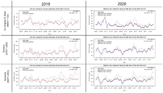 Example timeseries plots for 2019 and 2020 for Los Angeles N Main, Fontana, and Redlands monitors.