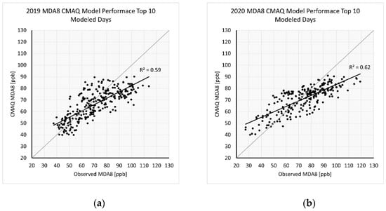 Prior to the dynamic model performance evaluation, we examined the model performance for the T10 modeled days that are used to calculate the RRFs. Figure 7 presents a scatter plot of observed versus modeled MDA8 for each day in the T10 modeled days at each monitoring site for 2019 and 2020 in panel (a) and (b), respectively. These points are a subset of the data in Figure 5a. Considered across all sites, the model performance is similar between the two years and has a similar underestimation bias that almost achieves (−6.3% in 2019) or does achieve (−4.0% in 2020) the ozone performance goal for NMB (±5%), with NME achieving the performance goal in both years (<15%). However, the model underestimates the highest observed MDA8 ozone concentrations. Model performance statistics for the selected sites is shown in Table 2.
