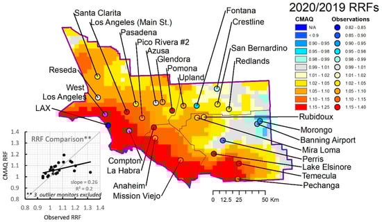 We present the results of the dynamic evaluation of the CMAQ model with standard projection procedures (i.e., based on RRFs) that are used for model attainment demonstrations in this section. Figure 8 is a spatial plot that compares gridded CMAQ RRFs with observed RRFs at monitoring sites across the SoCAB. Over much of the SoCAB, the modeled and observed RRFs are consistent and estimate that T10 modeled day ozone increased between 2019 and 2020 with some exceptions: (1) The two monitors furthest east in the SoCAB (Banning Airport and Morongo), where both the modeled and observed RRFs agree that ozone is reduced; (2) Sites near the coast (e.g., West LA, LAX, and Compton), where the model estimates ozone increases (RRF > 1.15), while the observed RRFs decreased; (3) At five additional locations throughout the basin, where both modeled and observed changes were small to moderate but may change in the opposite direction (i.e., Crestline and Perris, where the model estimates essentially no change in the RRFs and the observed RRFs indicate a slight reduction; Azusa and Reseda, where the observed RRFs indicates no change and the model estimates a 5–10% increase; and, Fontana where observed RRF indicates a decrease of 2–5% and the model estimates an increase of 2–5%).