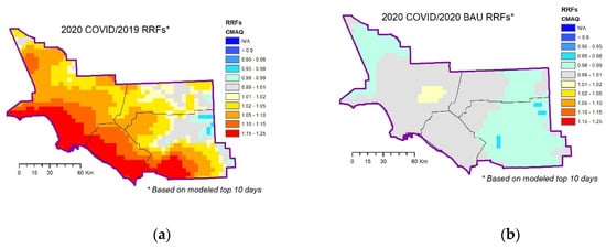 CMAQ derived RRFs: (a) 2020 COVID/2019 Base; (b) 2020 COVID/2020 BAU.