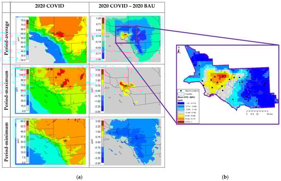 1 June–31 July impacts of the COVID-19 emissions reductions on ozone, estimated by CMAQ: (a) Period-average, period-maximum, and period-minimum MDA8 ozone spatial maps for 2020 COVID and 2020 COVID minus 2020 BAU; (b) Close up of period-average 2020 COVID minus 2020 BAU for SoCAB.