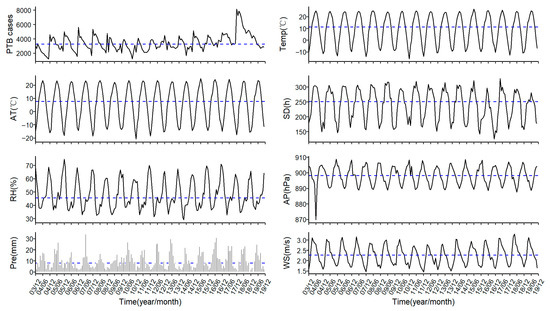 Figure 1. Time series of monthly PTB cases and meteorological factors in Xinjiang from 2004 to 2019. Abbreviations: Temp, air temperature (°C); AT, apparent temperature (°C); SD, sunshine duration (h); RH, relative humidity (%); AP, air pressure (hPa); Pre, precipitation (mm); WS, wind speed (m/s). Note: The blue dotted line represents the median.