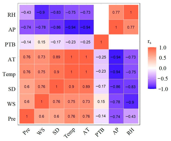In order to measure the nonlinear relationship between meteorological variables and PTB incidence, Spearman’s rank correlation analysis was used [26]. The correlation coefficient r s denotes the strength of an association between two variables, which can be calculated as follows [27]: