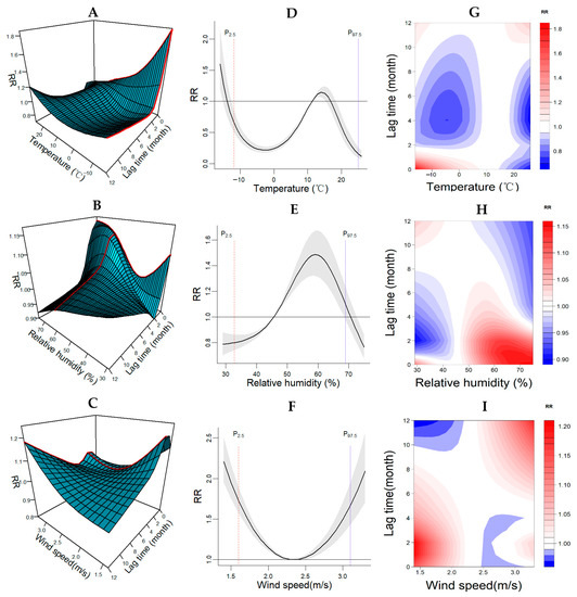 Figure 3. The exposure-lag-response correlations between meteorological factors and PTB incidence in Xinjiang from 2004 to 2019. (AC) represent the 3–D graphs of the relationships between air temperature, relative humidity, wind speed and PTB incidence, respectively. (DF) represent the overall cumulative relative risks of air temperature, relative humidity, wind speed on PTB incidence acrosslag 0–12 months, respectively. (GI) represent the heatmaps of air temperature, relative humidity, wind speed on PTB incidence, respectively.