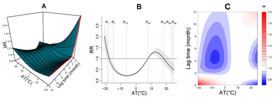 Taking the overall median of monthly average air temperature (11.3 °C) as a reference, it was obtained that the correlation between average air temperature and PTB incidence was nonlinear at 12 lag months for the general population, and the largest exposed and delayed cumulative effects occurred at −16.1 °C and lag 0 months, respectively (see Figure 3A). The overall exposure-response curve between air temperature and the incidence of PTB took on a U-type when the air temperature below 11.3 °C, with a maximum value, occurred at −16.1 °C (RR = 1.63, 95% CI: 1.21–2.20), whereas an inverted U-type when the air temperature was higher than 11.3 °C with a minimum value appeared at 26 °C (RR = 0.12, 95% CI: 0.06–0.20), as shown in Figure 3B. The association between extreme air temperature and the risk of PTB at specific lag months was shown in Figure 3B and Table S1. The lag 0–1 and lag 11–12 months could significantly increase the risk of PTB at extremely low air temperature −11.9 °C (2.5th percentiles), with a peak at lag 0 (RR = 1.59, 95% CI: 1.53–1.66). The cumulative risk at lag 12 months was largest (RR = 1.19, 95% CI: 1.14–1.24) at the extremely high air temperature 25 °C (97.5th percentiles). The relationship of air temperature-lag-PTB was evaluated by using the heatmap, as shown in Figure 3C.