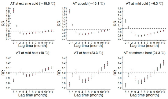 It is noteworthy that the lag effects of low AT presented a V-shape with the highest risk at lag 0, whereas the lag effects of high AT presented an N-shape with the highest risk at lag 12 (see Figure 5). As shown in Figure 5, lag 0 and lag 1 could significantly increase the incidence of PTB at the extreme cold, with the highest risk at lag 0 (RR = 1.81, 95% CI: 1.73–1.90). The cold had a significantly risky effect on increasing PTB incidence at lag 0–1, with the highest risk at lag 0 (RR = 1.60, 95% CI: 1.54–1.67), which was a protective factor for the risk of PTB at lag 2–11. The mild cold had a significantly risky effect on increasing the incidence of PTB at lag 0 and lag 1, with the highest risk at lag 0 (RR = 1.22, 95% CI:1.19–1.26), which was a protective factor for the risk of PTB at lag 2–12. The mild heat had a significantly risky effect on increasing the incidence of PTB at lag 2 and lag 9–12, with the highest risk at lag 12 (RR = 1.11, 95% CI: 1.09–1.14), which did not significantly influence the incidence of PTB at lag 3. The heat and extreme heat had a significantly risky effect on increasing the incidence of PTB at lag10–12, with the highest risk at lag 12 (RR = 1.18, 95% CI: 1.14–1.22 and RR = 1.20, 95% CI: 1.15–1.25), which did not significantly influence PTB incidence at lag 2 and lag 8–9.