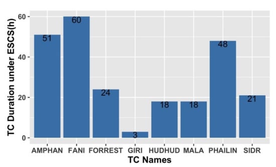 Duration (in hours) of tropical cyclones in the extremely severe cyclonic storm (ESCS) category over the BoB. TC names are mentioned along with the number of hours spent in the ESCS category on each bar. Data used for the duration of years 1990–2020 from the IMD data available from IBTrACS (https://www.ncei.noaa.gov/data/international-best-track-archive-for-climate-stewardship-ibtracs/v04r00/access/csv/) (accessed on 15 December 2021).