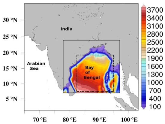 The coupled atmosphere–ocean (WRF–ROMS) model was configured over the BoB domain of 78° E–97° E and 7° N–24° N as shown in Figure 2. The area bounded by a square drawn in a dashed line shows the boundary of the inner movable domain of the WRF model, which follows the centre of the tropical cyclone as it propagates over the BoB. The outermost border of the domain represents the outer domain of the WRF model. The re-positioning of the inner domain occurs at 30 min intervals enabling maintaining a centre for the cyclone (i.e., the minimum pressure) inside the high-resolution inner domain. The ROMS model domain is shown with a solid continuous line covering the BoB region. The coupling between ROMS and WRF models was conducted in such a way that both the WRF model domains interact with the ROMS model. Numerical simulations are performed from 29 April (00:00 GMT) to 4 May (00:00 GMT) 2019. The initial and lateral open boundary conditions in the ROMS model were derived from the HYCOM data (from 29 April to 4 May 2019 at daily time intervals and 1/12 degree resolution) and bathymetry was derived from the Gridded Global Relief Data (ETOPO2) with 2 min resolution.