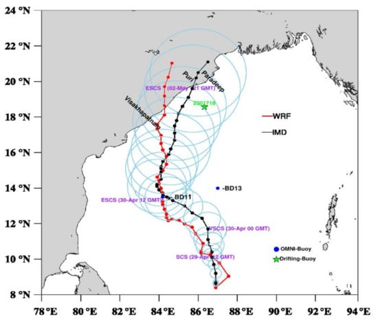 Figure 3 shows the coupled-model-simulated track (red curve) together with the best-track (black curve) of TC Fani reported by IMD. The 3-hourly positions of the cyclone’s centre are marked with dots on both tracks. Additionally drawn in the figure is the cone of uncertainty provided by IMD using ensemble model runs at different hours during the progress of TC Fani. It can be inferred from the figure that the model-simulated track is well within the projected cone of uncertainty by IMD. However, there is a mean error of the order of 100 km in the simulated track with respect to the IMD best-track. IMD provides the best-track estimate of a cyclonic storm based on various observations and models []. A validation of simulated wind speed and mean sea level pressure (MSLP) at the locations of buoys BD11 and BD13 (marked with blue circles in Figure 3) is shown in Figure 4. There was no spatial or temporal interpolation performed on the buoy or model data. The simulated values are considered from the model grid where the buoy was located. It is worth noting that BD11 was in close proximity to Fani’s track whereas BD13 was at a distance of about 250–300 km from the TC track. The temporal variations in surface wind speed and MSLP are captured well by the model at the BD11 location. However, there was a data gap in BD11 measurements during the high-intensity period of TC Fani after 15 GMT on 30 April. The continuous measurements at BD13 mark the typical features of cyclone’s passage as an increase in wind speed and drop in MSLP as the cyclone approaches this location. With the departure of the cyclone over this location, wind speed and MSLP gradually restored to the pre-cyclone values. At the BD13 location, the coupled model simulates the intensification and weakening stages of TC Fani in accordance with the buoy measurements for the simulation period. For wind speed, the RMSE was 2.9 (3.6) m/s for BD11 (BD13) and correlation was 0.92 (0.64) at BD11 (BD13) locations. For MSLP, the RMSE was 4.13 (1.62) hPa for BD11 (BD13) and correlation was 0.94 (0.89) at BD11 (BD13) locations. Compared to an uncoupled model, the fully coupled COAWST model was found to have a modest improvement in track and significant improvement in intensity simulation of hurricane Ivan []. The sea surface temperature (SST) recorded at a drifting buoy (marked by a green star in Figure 3) is plotted in Figure 5. The model-simulated SST time series at this location is also plotted for the duration of the simulation. It is clear from the figure that the ocean model ROMS in the coupled model represents the SST variations realistically. The decrease in SST from the middle of 30 April can be seen in both model and observation. This surface cooling is associated with the TC Fani by means of cyclone-induced upwelling and inertial mixing [,].