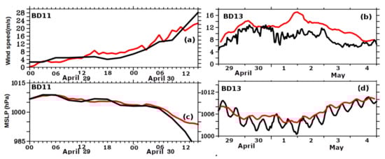 Comparison of model simulation (red) and observed (black) wind speed (a,b) (m/s) and mean sea level pressure (c,d) (hPa) at buoys BD11 and BD13 (buoy locations marked in Figure 3).