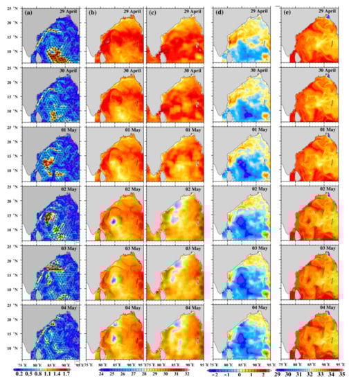The spatial patterns of SST, surface circulation, and salinity as simulated by the coupled model are presented in Figure 6. These parameters are plotted at 00 GMT each day from 29 April to 4 May 2019. Variation in the daily SST pattern is validated against GHRSST (Group for High-Resolution Sea Surface Temperature) data (accessed on 10 February 2020 from https://doi.org/10.5067/GHGMR-4FJ04). The GHRSST data have a resolution of 0.05° []. However, the daily surface currents and surface salinity could not be validated due to the non-availability of these data on a daily time scale. Surface currents plotted for each day clearly show the cyclonic circulation appearing in the southern BoB on 29 April with a magnitude of up to 1.8 ms−1. This cyclonic current pattern moves northwestward towards the Indian coastline on 30 April–1 May. Surface currents then follow the track of TC Fani and are seen interacting with the East India Coastal Current.