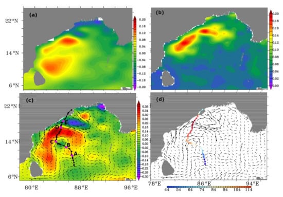 A mesoscale eddy over the ocean plays an important role in deriving local circulation and dynamics. During the TC, the presence of these eddies can impact the oceanic response by changing the rate of upwelling and entrainment []. It has been suggested that pre-existing positive sea surface height anomaly (SSHA) features or anticyclonic ocean eddies (ACOEs) play essential roles in the upper ocean’s response to cyclones. Several studies suggested rapid TC intensification when the storms interact with warm ocean eddies [,,,]. The mesoscale eddies are a prominent feature of the BoB. The highest eddy kinetic energy (EKE) activated regions of BoB are identified and studied by []. The east of Sri Lanka, northwest of Sumatra, the western BoB and the coastal rim of BoB are the EKE dominating areas, and each area produces a high magnitude of EKE by virtue of different oceanic processes and their combinations []. The seasonal presence of these eddies is seen in the regions as mentioned above []. The mesoscale eddies can be treated as baroclinic instabilities. The TCs over BoB are predominant in the April–June and October–December months. During these two different time spans of favourable season for TCs, two different eddy features (cyclonic and anticyclonic) were also confined over a large area of north BoB.