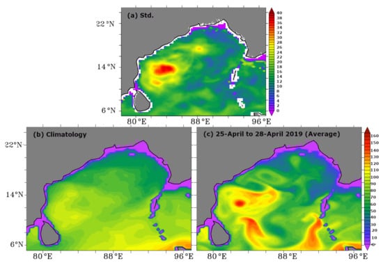 As TCHP measures the integrated vertical temperature of the ocean from the surface to the depth of the 26 °C isotherm (D26), it is, therefore, a measure of the heat energy of the ocean, it plays a significant role in the formation and intensification of tropical cyclones [,,,,,]. The ECCO2 (Estimating the Circulation & Climate of the Ocean) reanalysis data [] with a resolution of 0.25° are used to calculate the TCHP over the BoB. Figure 8 shows climatological values of TCHP for 25 April–10 May (panel a) and standard deviation of TCHP for April (panel b) during the period of years 2008–2018. In panel (c) of this figure, TCHP is plotted for 25–28 April 2019 (period of TC Fani). It can be noted from the figure that anomalously high TCHP was present during the occurrence of TC Fani in the BoB. While the climatological TCHP in the western BoB was up to 110 kJ cm−2, its value was >160 kJ cm−2 during the period of TC Fani in April 2019, which was much above one standard deviation of TCHP. This excess heat content of the upper ocean helped fuel the cyclone to greater intensity. The region of higher TCHP in the bay was primarily associated with the mesoscale warm-core eddies.