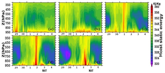 Model-simulated moist static energy (kJ kg−1) over the locations A, B, C, D, E (marked in Figure 6) in panels (a–e), respectively.