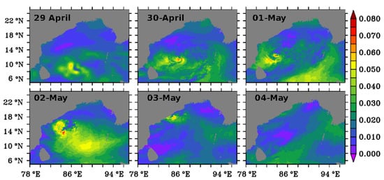 Model-simulated daily wind shear gradient (Nm−2) (850–300 hPa) at 00 GMT each day for 29 April to 4 May 2019, during the passage of TC Fani over the BoB.