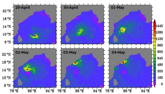 Model-simulated daily latent heat flux (Wm−2) at 00 GMT each day for 29 April to 4 May 2019, during the passage of TC Fani over the BoB.