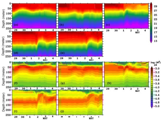 where g is the acceleration due to gravity, z is depth, and is the density of seawater. The magnitude of initial stratification at point A (panel f) reduced with time as the TC moved over locations B and C. The strong turbulent mixing under the cyclone weakened the stratification and distributed heat in the water column. However, the stratified layer moved upward towards the surface on 1 May at location C (panel h). At locations D and E, the subsurface mixing continued and the position of stratification maxima remained around 50 m depth at locations D (panel i) and E (panel j), which restricted the entrainment of colder waters from below the thermocline.