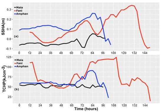 Along-track sea surface height anomaly (SSHA in m) (a) and along-track tropical cyclone heat potential (TCHP in kJ cm−2) (b) for cyclones Mala, Fani, and Amphan formed over the BoB during the pre-monsoon season (April–May).