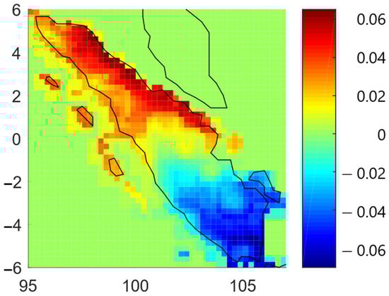 As mentioned before, there have been only a few large fire events during the second dry season on Sumatra with equatorial-type precipitation. One of the most significant events occurred in 2013 [], with a total rainfall of 56.08 mm during the peak fire events in June. Considering that 2013 was a normal year, the analysis would be even more inaccurate if we had not separated the extreme event from the previous analysis.