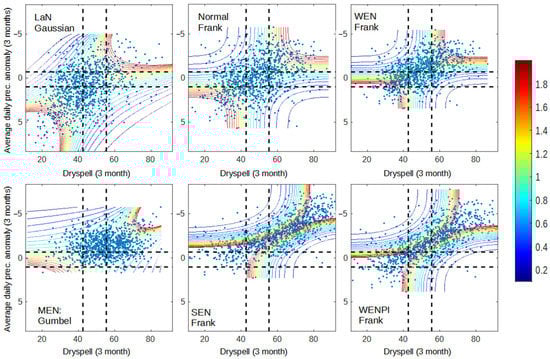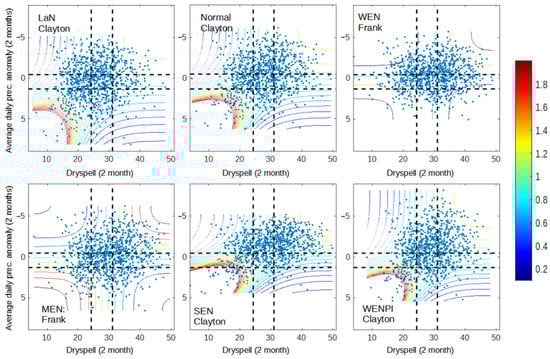 Despite the fact that precipitation anomaly better represents El Niño impact, both dry spell and precipitation anomaly have a close relationship with the hotspot (Figure 3 and Figure 4). Figure 3 and Figure 4 show that the occurrence of El Niño and positive IOD increases the occurrence of data points in the dry condition (top right) and increases the dependency during wet–wet (bottom-left box) and dry–dry conditions (top-right box). However, in terms of modeling, dry spell and hotspot are more likely to be easier to model with copula since all conditions lie within the same copula family, except for SEN, which only occurred in one year. Precipitation anomaly has a more diverse copula family.