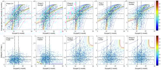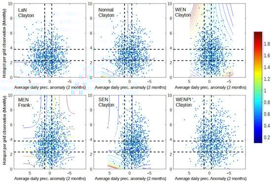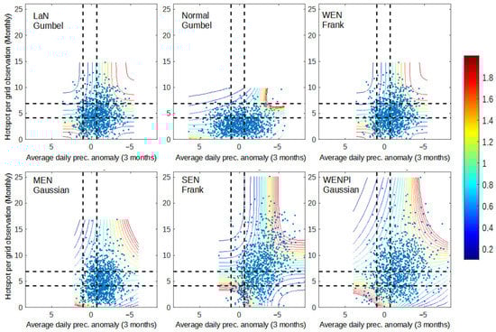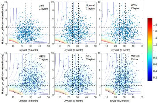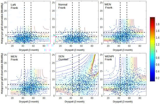 Figure 10 shows that during extreme events, the dependence in all variable pairs’ increases significantly, particularly in the dry condition. Dry spells and prec. anomalies have more consistent dependency following the Gaussian copula family during extreme events. Therefore, dependency in wet–wet conditions is quite similar to dependency in dry–dry conditions. Significant improvement was also observed in the dry condition of dry spell–hotspot and prec. anomaly–hotspot dependency, implying that more fire events occurred in dry–dry conditions when compared to the previous section. However, all pairs of variables lie in different copula families, which are Gaussian (dry spell–prec. anomaly), Frank (dry spell–hotspot), and Gumbel (prec. anomaly–hotspot). This result shows that all three variables have different characteristics from each other and can be difficult to model.