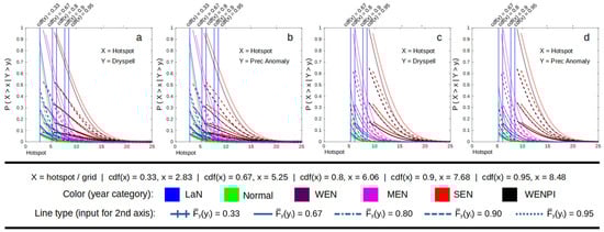 From the dependency analysis, we can conclude that the difference between La Niña, a normal year, and a weak El Niño is insignificant, except in extreme dry conditions (Figure 2, Figure 3 and Figure 4). The difference is more noticeable during MEN, SEN, and WENPI, which can be categorized as extreme conditions. Therefore, in the conditional survival probability analysis, we add another three conditions to the hotspot, which are conditions with 0.8, 0.9, and 0.95 values of the cumulative density function (CDF) to evaluate how El Niño and IOD influence the probability of extreme conditions. This section also only focuses on the probability of hotspots, so dry spells and precipitation anomalies are not analyzed. The result of the conditional survival probability calculation using Equation (9) is a 3D space respective to the values of x and y. It would be difficult to compare multiple graphs from different categories caused by the intersection of the 3D space. Therefore, we add some constant values that represent the wet and dry conditions of common climate analysis to reduce the figure dimension to 2D and make it easier to interpret. For example, during wet conditions of a dry spell (Figure 5a), the graph is calculated using the following equation: