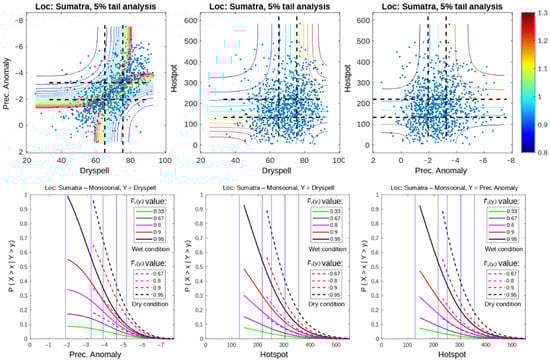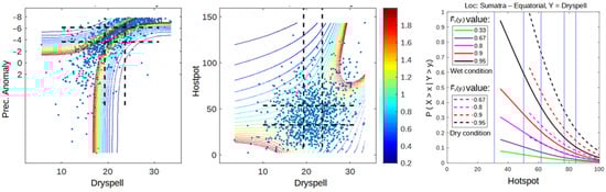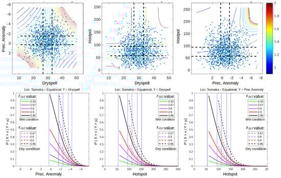 In this section, only 5% of the upper tail of each univariate distribution is examined. This analysis is done to calculate the extreme events regardless of the conditions of ENSO and IOD. Using this analysis, we assume that the hotspot is only triggered by the climate condition of its climate as long as the climate condition meets the 5% upper tail quadrant []. The results show that the dependency of dry spell and precipitation anomaly is more consistent in the 5% upper quadrant during wet–wet, normal–normal, and dry–dry conditions. By acknowledge the result in Section 3.1.1 that the dependency between dry spell and precipitation has increased as a result of the increased dry conditions. Therefore, the use of both variables in extreme event modeling can be unnecessary to some degree. This is represented by Figure 6, where dry spell and anomaly result in almost identical dependency (Copula Frank family) when paired with a hotspot, as well as conditional probability graphs when used to calculate the survival probability function of a hotspot.