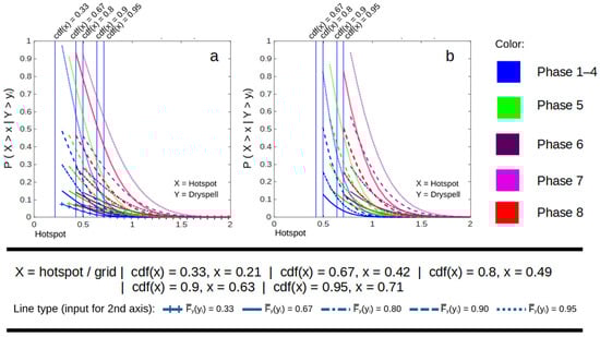 In increasing hotspot probabilities, phase 6 has the highest impact on dry spell–hotspot joint probability, followed by phases 8 and 7, which have very similar impacts. An unclear impact occurred in phase 5, resulting in less dependency in Figure 11. The probability of a hotspot in Figure 12 is increased compared to phases 1–4. Figure 12 depicts the dryer conditions during phase 5, which is more consistent with previous research [,,].