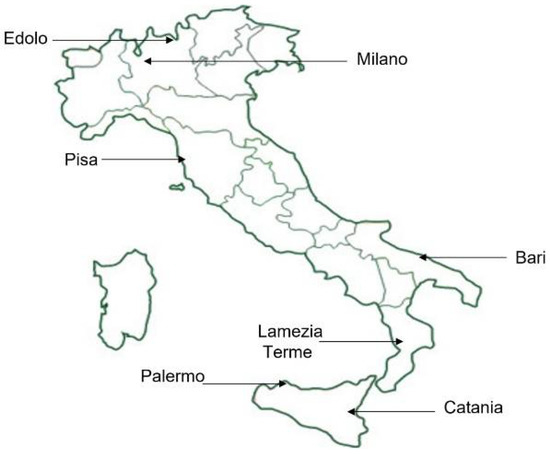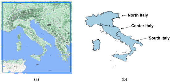 Analysis was conducted over the Italian area, considering the second level of NUTS2 (Nomenclature des Unités Territoriales Statistiques) repartition but, for simplicity, in this work the sensitivity results are presented in the three macro-areas shown in Figure 1b.